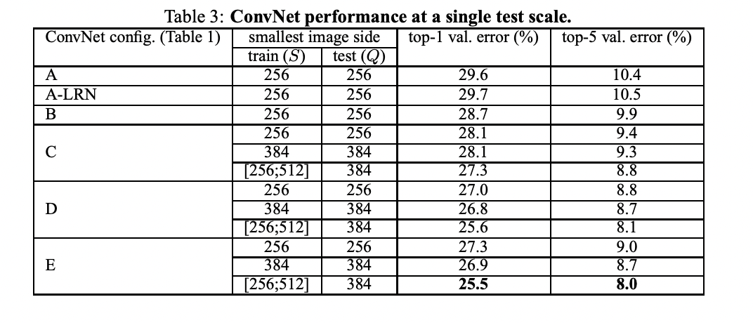 Section 2.2에서 서술하였던 것과 동일한 configuration을 기반으로, 각 ConvNet 모델의 성능을 측정하였습니다. 테스트 이미지 사이즈 Q는 고정된 S와 [min S, max S] 범주 내의 0.5 * (min S + max S) 값과 동일합니다. 결과는 위 Table 3에 나와있습니다.