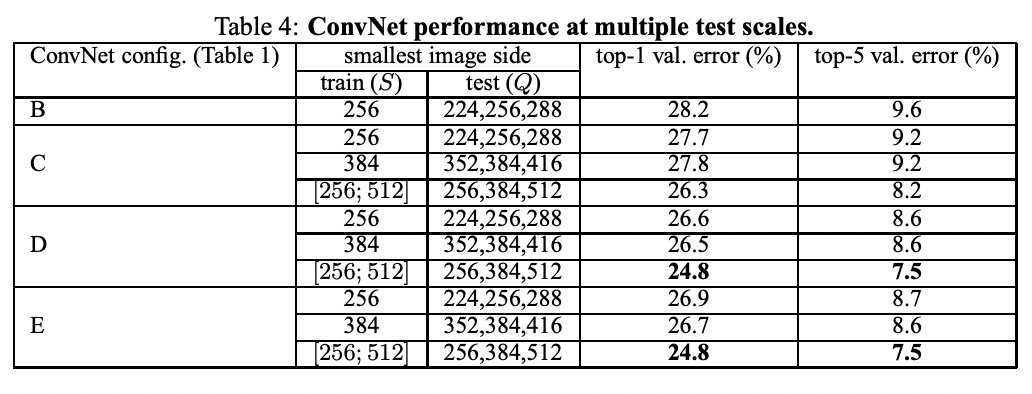 실험 결과는 Table4에 정리되어 있으며, test할 때에도 scale jittering이 더 좋은 성능을 보여준다는 것을 알 수 있습니다.