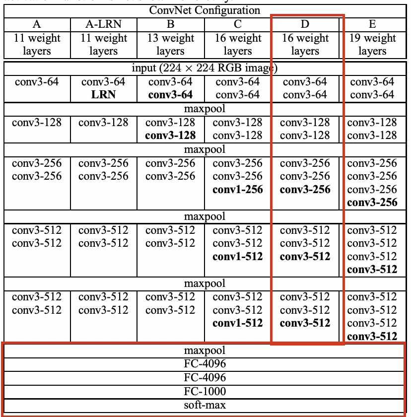 Convolution layer stack은 두 개의 4096 채널의 FC layer와 1개의 1000 채널의 FC layer로 구성되었으며, 마지막 레이어는 soft-max layer 입니다. FC layer의 configuration은 모든 네트워크에서 동일합니다.